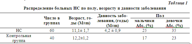 также действует на клетки-медиаторы сосудистого повреждения, а его протромботическое действие подтверждено не всеми исследователями [2, 4, 9]. Таким образом, широкое применение ГКС и ЦФ, в частности, методов интенсивной терапии, в лечении нефротического синдрома у детей оказывает влияние на систему свертывания крови. Однако на сегодняшний день не достаточно изучено оценка влияния пульс-терапии на тромбоцитарно-сосудистый гемостаз. Проведение такой оценки позволит выявлять и предупреждать возможные тромботические или тромбогеморрагические нарушения, которые индуцируются или усугубляются пульс-терапией, и тем самым повысить эффективность лечения больных нефротическим синдромом. Цель исследования. Выявить особенности изменения параметров тромбоцитарно-сосудистого гемостаза у больных нефротическим синдромом, оценить динамику их изменения на фоне различных программ пульс-терапии мегадозами ГКС и ЦФ. Задачи исследования: Оценить параметры тромбоцитарно-сосудистого гемостаза у больных НС до проведения пульс-терапии мега-дозами ГКС и ЦФ и после нее. Провести сравнительный анализ влияния различных программ пульс-терапии на показатели тромбоцитарно-сосудистого гемостаза у больных с НС. Оценить риск развития побочных явлений со стороны системы первичного гемостаза у больных НС в зависимости от схемы проводимой интенсивной терапии. Материал и методы: В исследование включены 98 больных с НС, находящихся на стационарном лечение и диспансерном наблюдении Все больные, вошедшие в группы исследования, на момент поступления в клинику (перед началом интенсивной терапии) получали преднизолон в дозе 2мг/кг\сутки, а также поддерживающие дозы антигарегантов (курантил 5мг\кг\сутки). Доза антиагрегантов не изменялась в ходе пульс-терапии и в течение 10 дней после нее, в дальнейшем больным с повышенными показателями тромбоцитарно-сосу-дистого гемостаза антиагреганты назначались внутривенно. Характеристика пациентов по полу, возрасту, давности заболевания представлена в таблице 1. |