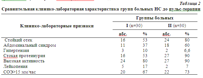 Среди наблюдаемых больных острое течение имело место у 10 (16%), подострое у 29 (48%), хроническое у 21 (36%) пациента. У 92% больных отмечена высокая активность НС, у 8% - умеренная степень активности. Все больные НС были разделены на 2 группы в зависимости от метода проведения пульс-терапии. В первой группе проводилась трехдневная пульс-терапия метилпреднизоло |
