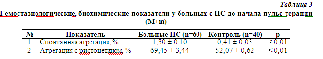 Повышение спонтанной агрегации тромбоцитов служит безусловным признаком активации первичного гемостаза. У больных НС, включенных в исследование, такое повышение встречалось в 48 (80%) случаев. Маркерами гиперкогуляции при НС у детей является повышение индуцированной агонистами агрегации тромбоцитов [6]. Одним из таких агонистов является ристоцетин, который косвенно может также отражать степень активации эндотелия, так как зависит от концентрации фактора фон Виллебранда и его активности в плазме крови.Введение в нефрологическую практику метод интенсивной терапии с массивнымы дозами глюкокортикоидов и ударных дозах циклофосфана, позволило улучшить прогноз у больных с такими ранее некурабель- |