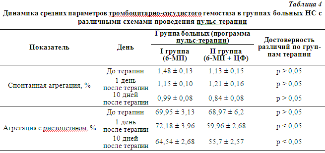 ными состояниями НС. Несомненно, что помимо выраженного влияния на воспаление и иммунные реакции организма, терапия ГКС и цитостатиками оказывает влияние на состояние свертывающей системы крови. В настоящем исследовании влияния интенсивной терапии на тромбоцитарно-сосудистый гемостаз у больных СКВ были выявлены особенности изменения изучаемых показателей в зависимости от схем проводимой пульс-терапии. Оценка состояния тромбоцитарно-сосудистого гемостаза, определение вазоактивных аминов в плазме крови проводилось на 1 и 10 дни после окончания пульс-терапии. Динамика данных показателей и сравнительная оценка их изменения в 2 группах больных представлены в таблице 4. |
